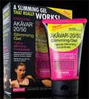 Akavar 20/50 slimming gel claims to be the "European miacle pill changing concept of dieting in USA". Akavar 20/50 comes in two different products - a weight loss pill containing "fast acting caloric restricting compound", and a weight loss gel. The Akavar 20/50 slimming gel is claimed to " reduce the appearance of bulging pockets of unsightly fat wherever they appear".